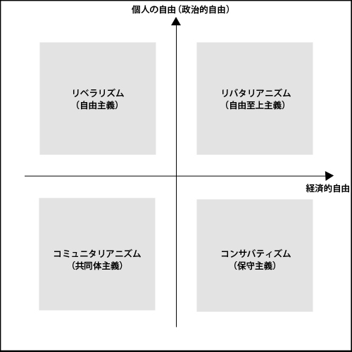 また、「保守・右翼」と「リバタリアニズム」は、「経済の自由」を重んじる点では一致していますが、「個人の自由」や「政治的な自由」においては対立しています。